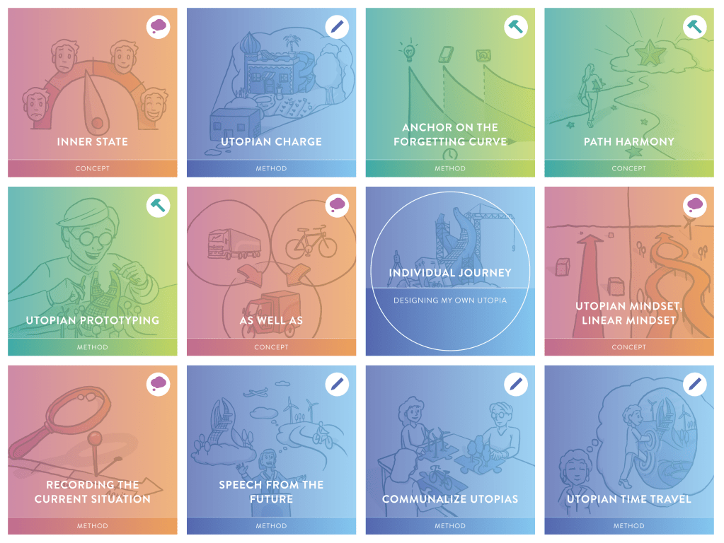“Utopias serve you – used correctly – both as distant guiding stars, but also as a direct orientation at the individual stages of your project. The utopian toolbox provides you with a number of methods to develop your own utopias as well as utopias for groups and organizations. You’ll also come with tools that help you see a world full of potentials and bring your utopia into reality.”