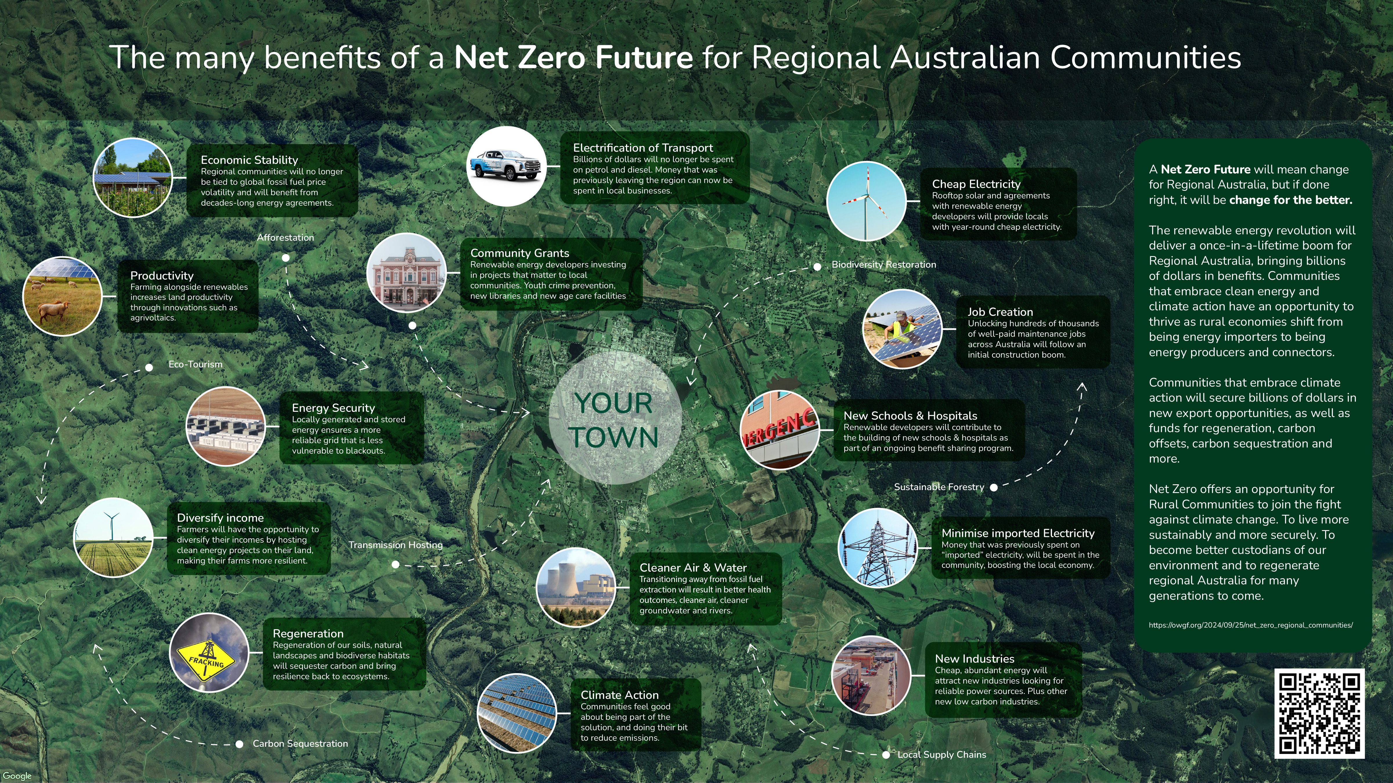 Despite what the Fossil Fuels lobbyists and their Politicians say Net Zero is a huge opportunity for Regional Australia. The journey towards a Net Zero future will involve many significant changes for regional Australia, but it is a change filled with promise. Communities that embrace clean energy and climate action stand to gain billions in economic benefits, new job opportunities, and improved health outcomes. By capitalising on these developments, regional communities can evolve from energy importers to energy producers, paving the way for a prosperous and sustainable future.